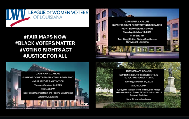 LWVLA StatementLWV of Louisiana President M. Christian Green issued the following statement upon the filing of the amicus brief: “The League of Voters of Louisiana has been working with partners to pursue fair congressional maps in our state for the last four years. For the first time in decades, communities with shared interests were able to elect a candidate of their choice in 2024 and to enjoy real representation in Congress. Section 2 of the Voting Rights Act, like racial discrimination and disempowerment in Louisiana, is not an antiquated relic of the past — it has real effects that persist today on which voters deserve to have a voice. Section 2 is intended to secure effective representation to address real community needs — transportation, education, recreation, economic development — that are ongoing and have persisted to the present day. Effective representation in Congress that is responsive to community needs, interests, and aspirations can secure federal resources to address these problems for everyone’s benefit. Redistricting must be about fairness, justice, and effective representation of all communities!”